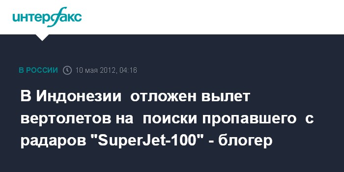 Москва.10 мая. ИНТЕРФАКС - Блогер Сергей Доля, находящийся в Джакарте, сообщил, что вылет вертолетов, отправляющихся на поиски поиски SSJ-100, пропавшего с радаров в среду после демонстрационного полета в