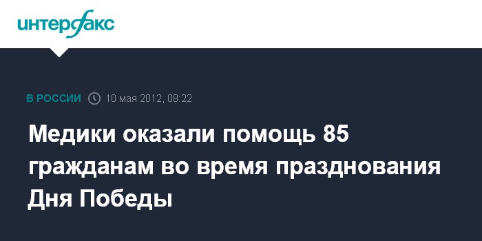 Москва. 10 мая. INTERFAX.RU - За медицинской помощью в День Победы обратились 85 человек, принимавших участие в массовых мероприятиях в столице, сообщил "Интерфаксу" источник в медицинских кругах города.