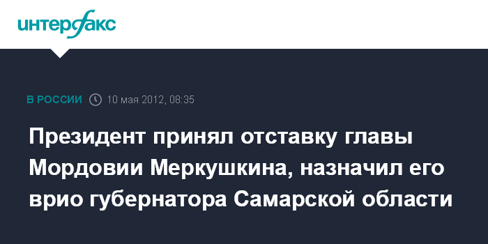 "В связи с заявлением Главы Республики Мордовия Меркушкина Н.И. о досрочном прекращении полномочий постановляю принять отставку Меркушкина Н.И. по собственному желанию", - говорится в сообщении.