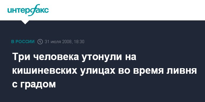 Москва. 31 июля. INTERFAX.RU - Три человека погибли в Кишиневе во время обрушившегося на город проливного дождя с градом, сообщили "Интерфаксу" в департаменте чрезвычайных ситуаций МВД Молдавии.