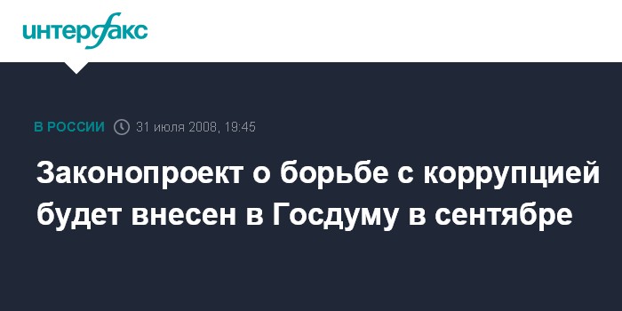 Москва. 31 июля. ИНТЕРФАКС - Законопроект о противодействии коррупции будет внесен президентом в Госдуму в сентябре, сообщила помощник президента РФ, начальник государственно-правового управления президента РФ Лариса Брычева.