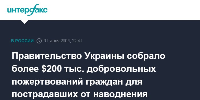 Киев. 31 июля. ИНТЕРФАКС-УКРАИНА - Граждане Украины собрали уже 1 млн. гривен (более $200 тыс.) в помощь пострадавшим от стихийного бедствия регионам, сообщила премьер-министр Юлия Тимошенко.
