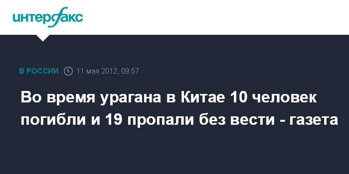 Пекин. 11 мая. INTERFAX.RU - 10 человек погибли и 19 пропали без вести во время урагана, обрушившегося на округ в северо-западной китайской провинции Ганьсу, сообщает газета The China Daily в пятницу.