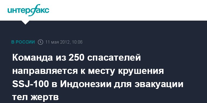 Джакарта. 11 мая. INTERFAX.RU - Новая команда из 250 спасателей в пятницу прибудет к месту крушения российского самолета Sukhoi SuperJet 100, где приступит к эвакуации тел погибших пассажиров и членов экипажа, сообщает местная газета "Джакарта глоб".