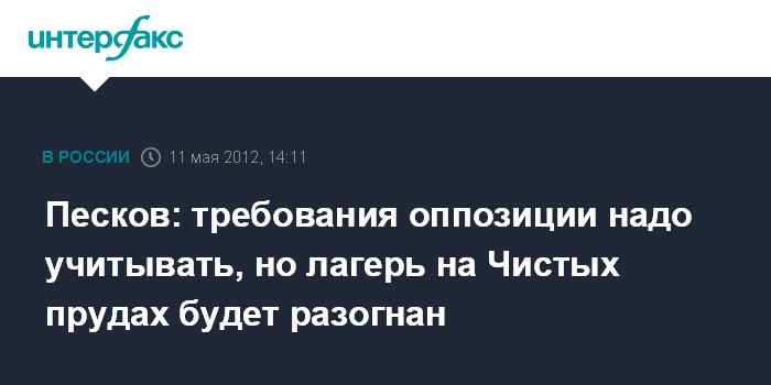 Москва. 11 мая. INTERFAX.RU - Пресс-секретарь премьер-министра РФ Дмитрий Песков считает, что от разумных и конструктивных требований оппозиции не нужно абстрагироваться, однако лагеря в Москве на Чистых прудах не будет, поскольку он незаконен.