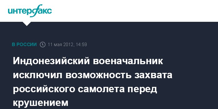Джакарта. 11 мая. INTERFAX.RU - Командующий вооруженными силами Индонезии Агус Сухартоно исключил возможность того, что российский самолет Sukhoi Superjet 100, потерпевший катастрофу на этой неделе, во время демонстрационного полета был захвачен террористами.