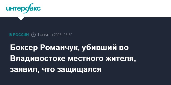 Москва. 1 августа. INTERFAX.RU - Известный российский боксер Роман Романчук, прибывший во Владивосток на сборы вместе с олимпийской сборной по боксу, заявляет, что не виновен в гибели местного жителя.