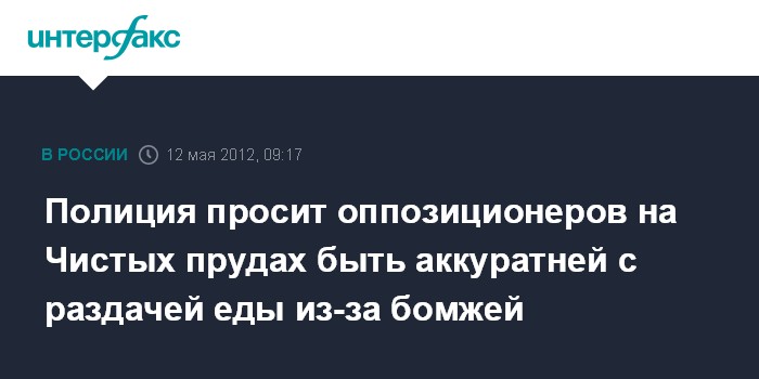 Москва. 12 мая. INTERFAX.RU - Сотрудники полиции обратились к оппозиционерам быть более внимательными при раздаче еды в лагере на Чистых прудах, передает корреспондент "Интерфакса".