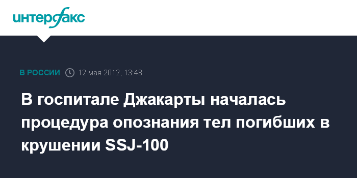 Джакарта. 12 мая. INTERFAX.RU - В госпитале Джакарты началось опознание тел погибших при крушении самолета Sukhoi Superjet-100, в процессе вместе с криминалистами принимают участие родственники погибших, сообщают в субботу местные СМИ.
