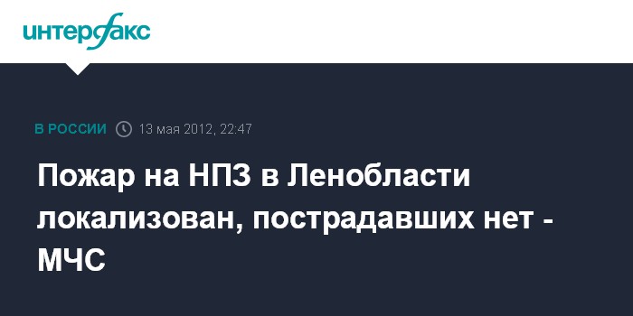 Санкт-Петербург. 13 мая. ИНТЕРФАКС - Пожар на НПЗ в Ленинградской области локализован, сообщают в региональном управлении МЧС РФ по области.