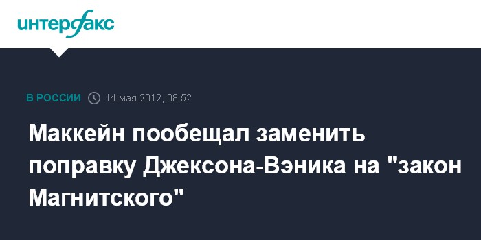 Москва. 14 мая. INTERFAX.RU - Влиятельный американский сенатор, республиканец Джон Маккейн считает, что "Закон Магнитского" будет привязан к отмене поправки Джексона-Вэника.