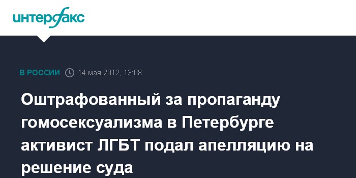Санкт-Петербург. 14 мая. INTERFAX.RU - Основатель Московского гей-прайда Николай Алексеев обжаловал в Смольнинском районном суде Петербурга постановление о штрафе за пропаганду гомосексуализма, сообщила пресс-служба движения GayRussia.