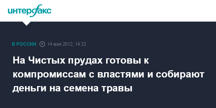 Москва. 14 мая. INTERFAX.RU - Обитатели лагеря оппозиции на Чистопрудном бульваре обещают выполнить требования департамента природопользования Москвы освободить газоны и намерены идти на компромисс в случае, если будут поступать другие претензии от коммунальных служб города.