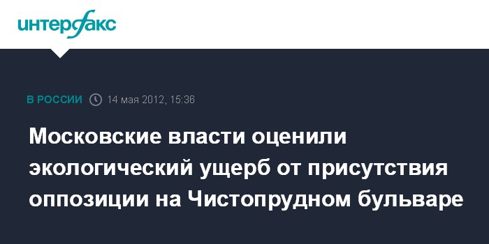 Москва. 14 мая. INTERFAX.RU - Ущерб экологии от действий оппозиционеров на Чистопрудном бульваре составил около 1 млн рублей, сообщили "Интерфаксу" в понедельник в пресс-службе департамента природопользования и охраны окружающей среды Москвы.