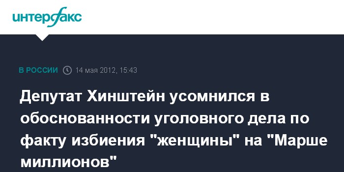 Москва. 14 мая. INTERFAX.RU - Зампред комитета Госдумы по безопасности и противодействию коррупции Александр Хинштейн обратился к генпрокурору РФ Юрию Чайке с просьбой проверить законность действий следователей ГСУ СК России по Москве, которые возбудили "без должных на то оснований" уголовное дело по факту избиения сотрудником полиции женщины в ходе так называемого "марша миллионов".
