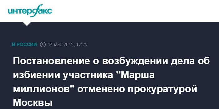 Постановление о возбуждении дела об избиении участника "Марша миллионов" отменено прокуратурой Москвы