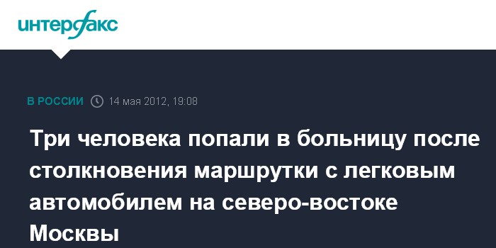 Москва. 14 мая. INTERFAX.RU - Три человека пострадали в результате ДТП с участием маршрутного такси на северо-востоке Москвы, сообщил в понедельник "Интерфаксу" источник в правоохранительных органах.