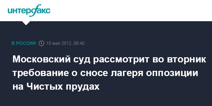 Москва. 15 мая. INTERFAX.RU - Басманный суд Москвы готовится рассмотреть требование депутата столичной городской Думы о ликвидации лагеря оппозиции на Чистых прудах.