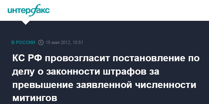 Санкт-Петербург. 15 мая. INTERFAX.RU - Конституционный суд РФ в пятницу провозгласит постановление по делу о проверке законности правовой нормы, по которой организаторы публичного мероприятия могут быть оштрафованы за превышение согласованной с властями численности участников.