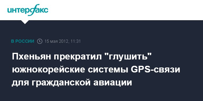 Сеул. 15 мая. INTERFAX.RU - КНДР с воскресенья прекратила наведение помех на системы GPS служб гражданской авиации Южной Кореи, что на протяжении последних двух недель отразилось на сотнях рейсов, сообщили во вторник сотрудники Корейской комиссии по связи.