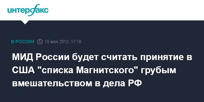 Москва. 15 мая. INTERFAX.RU - МИД России заявил, что принятие в США так называемого "списка Магнитского" было бы грубым вмешательством в дела РФ и надеется, что этого все-таки не произойдет.