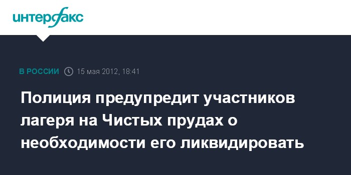 Москва. 15 мая. INTERFAX.RU - Участники лагеря на Чистых прудах будут предупреждены полицейскими о необходимости добровольной его ликвидации, сообщили "Интерфаксу" в пресс-службе ГУ МВД РФ по Москве.