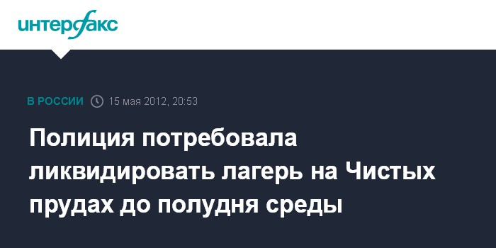 Москва. 15 мая. ИНТЕРФАКС - Сотрудник полиции предъявил решение Басманного суда о ликвидации лагеря на Чистых прудах оппозиционеру Илье Яшину, который зачитал текст у памятника Абаю Кунанбаеву, где скопилось большое количество обитателей лагеря и журналистов.