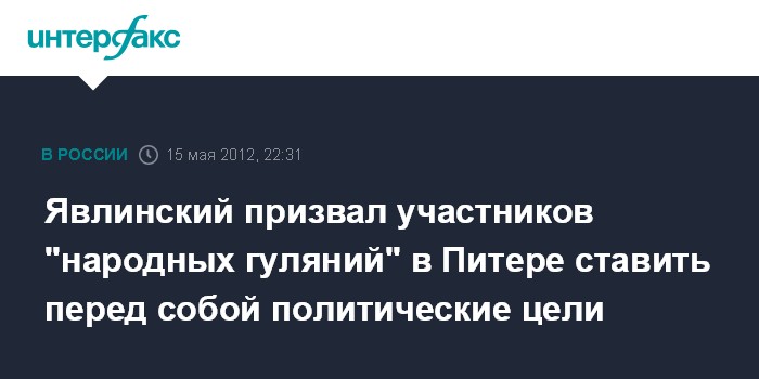 Санкт-Петербург. 15 мая. INTERFAX.RU - Основатель партии "Яблоко", депутат Законодательного собрания Петербурга Григорий Явлинский выступил перед собравшимися на Исаакиевской площади участниками "народных гуляний".