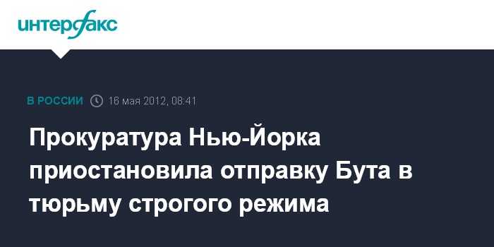 Лондон. 16 мая. INTERFAX.RU - Прокуратура Нью-Йорка приостановила перевод россиянина Виктора Бута из места предварительного наказания в супертюрьму в городе Флоренс, штат Колорадо, известную среди журналистов как Алькатрас Скалистых гор, передала телерадиокорпорация BBC.