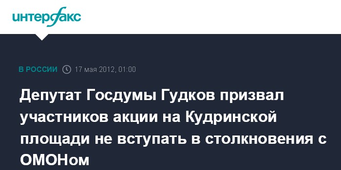 Москва. 17 мая. ИНТЕРФАКС - Представители полиции пообещали не задерживать участников оппозиционной акции на Кудринской площади при соблюдении общественного порядка, заявил депутат Госдумы Дмитрий Гудков собравшимся участникам мероприятия.