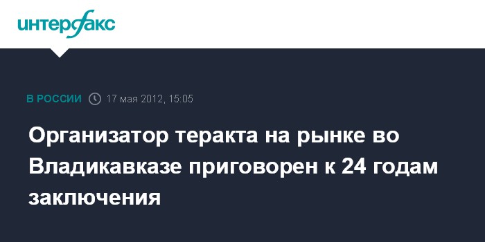 Владикавказ. 17 мая. INTERFAX.RU - Верховный суд Северной Осетии в четверг приговорил главаря банды Али Даурбекова, организовавшего теракт на рынке во Владикавказе в сентябре 2010 года к 24 годам колонии, передает корреспондент агентства "Интерфакс-Юг" из зала суда. В результате теракта 19 человек погибли, 233 получили ранения.