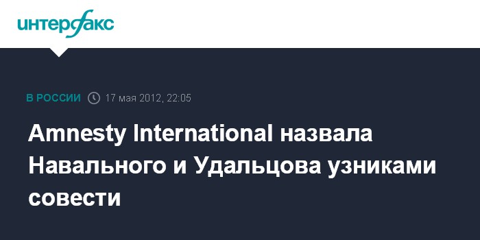 Москва. 17 мая. INTERFAX.RU - В международной правозащитной организации Amnesty International ("Международная Амнистия") признали российских оппозиционеров Алексея Навального и Сергея Удальцова, арестованных за неповиновение сотрудникам полиции на массовых акциях в Москве, узниками совести.