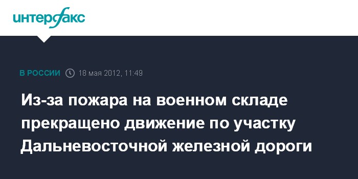 Владивосток. 18 мая. INTERFAX.RU - В связи с пожаром на складе с боеприпасами остановлено движение на участке Дальневосточной железной дороги.