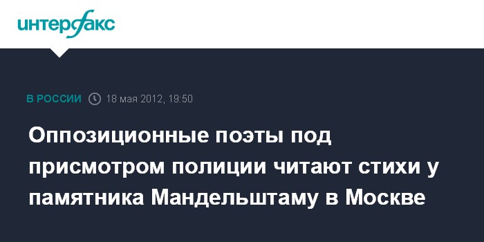 Москва. 18 мая. INTERFAX.RU - Около сотни оппозиционеров собрали в Москве "литературные чтения" у памятника Осипу Мандельштаму, неподалеку от станции метро "Китай-город".