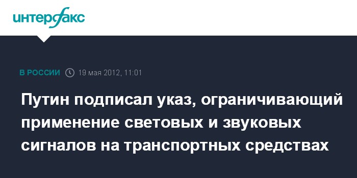 Москва. 19 мая. INTERFAX.RU - Президент России Владимир Путин подписал указ "Об упорядочении использования устройств для подачи специальных световых и звуковых сигналов, устанавливаемых на транспортные средства", сообщила в субботу пресс-служба главы государства.