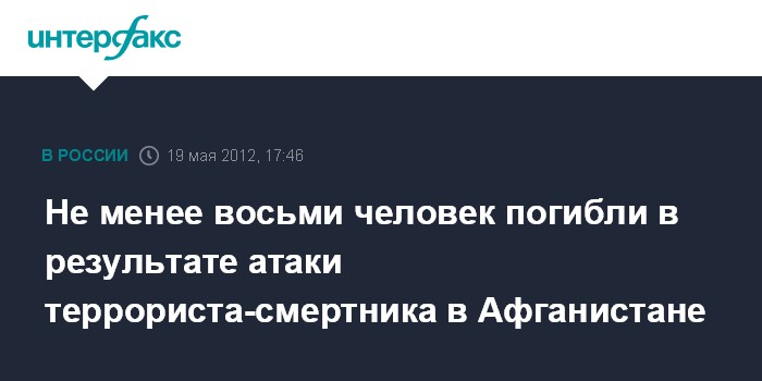 Кабул. 19 мая. INTERFAX.RU - По крайней мере, восемь человек стали жертвами подрыва террориста-смертника на полицейском КПП в провинции Хост на востоке Афганистана, сообщил в субботу начальник местной полиции генерал Сардар Мохаммад Зазиа. По его словам, смертник привел взрывное устройство в действие, когда его мотоцикл проверяли сотрудники полиции. В результате взрыва погибли два полицейских и шесть мирных жителей, еще один полицейский и один мирный житель получили ранения.