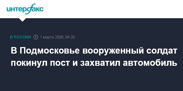 Москва. 1 марта. ИНТЕРФАКС – В поселке Нахабино Красногорского района Подмосковья солдат-срочник покинул боевой пост, под угрозой оружия угнал машину и направился по направлению к Москве. Вскоре дезертир был задержан нарядом ДПС Красногорска.