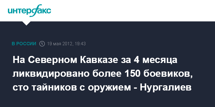 Пятигорск. 19 мая. INTERFAX.RU - Почти сто тайников с оружием, а также 38 баз боевиков было обнаружено за четыре месяца текущего года при участии сотрудников Главного управления МВД РФ по Северо-Кавказскому федеральному округу, сообщил на оперативном совещании в субботу в Пятигорске и.о. министра внутренних дел Рашид Нургалиев.