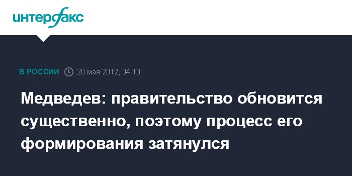 На пресс-конференции по итогам саммита G8 в Кэмп-Дэвиде Д.Медведев отметил, что именно кардинальным обновлением правительства объясняется достаточно длительный период его формирования.