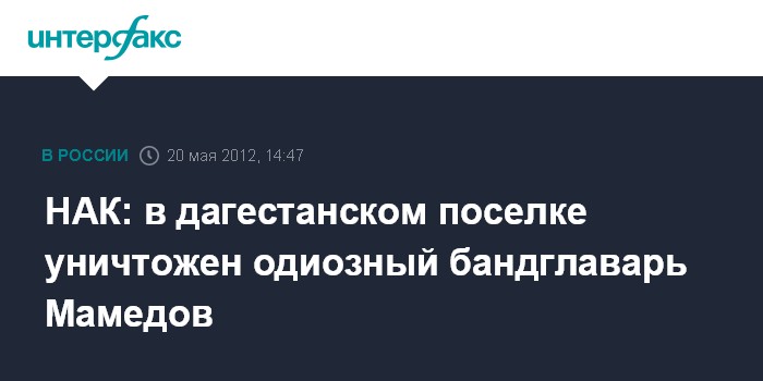 Москва. 20 мая. INTERFAX.RU - Национальный антитеррористический комитет (НАК) объявил об уничтожении в результате контртеррористической операции (КТО) в Дагестане главаря "хасавюртовской бандгруппы" Аслана Мамедова по кличке "Муас", который находился в федеральном розыске. "Нейтрализация такого одиозного главаря как Мамедов - это существенный удар по бандитскому подполью Дагестана", - отмечается в поступившем в воскресенье в "Интерфакс" сообщении Информационного центра НАК.