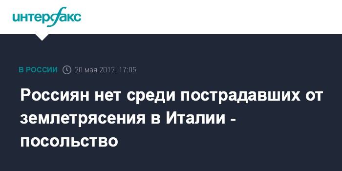 Рим. 20 мая. INTERFAX.RU - Российские туристы не пострадали от землетрясения в Италии. "В связи с землетрясением на севере Италии посольство России в Италии информирует, что среди пострадавших граждан России нет. Посольство находится в контакте с представителями итальянских спасательных служб", - говорится в сообщении российской дипмиссии.