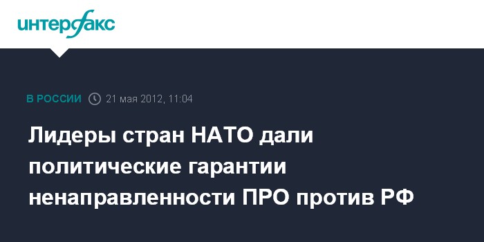 Чикаго. 21 мая. INTERFAX.RU - Лидеры стран-членов НАТО на саммите в Чикаго дали политические гарантии ненаправленности ЕвроПРО против России.