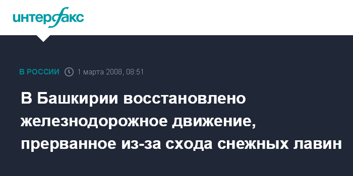 Уфа. 1 марта. ИНТЕРФАКС-ПОВОЛЖЬЕ - На участке Транссибирской магистрали, проходящей в зоне ответственности Башкирского отделения Куйбышевской железной дороги (КбшЖД), в субботу полностью восстановлено движение поездов, прекращенное в четверг из-за схода 17 снежных лавин.
