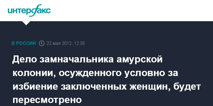 Благовещенск. 22 мая. INTERFAX.RU - Прокуратура добилась отмены приговора бывшему заместителю начальника колонии-поселения в Амурской области, который отделался условным сроком по делу об избиении заключенных женщин. Региональная прокуратура сообщила во вторник, что суд кассационной инстанции Амурской области отменил приговор Ивановского районного суда в отношении Сергея Зычкова за мягкостью назначенного наказания.