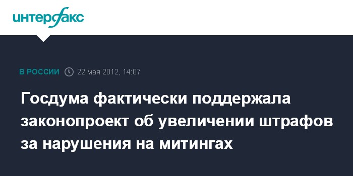 Москва. 22 мая. INTERFAX.RU - Госдума приняла за основу проект постановления, фактически поддержав в первом чтении законопроект об ужесточении штрафов за правонарушения в ходе массовых акций ("за" 234 при необходимом минимуме 226, 67 "против" и один воздержался).