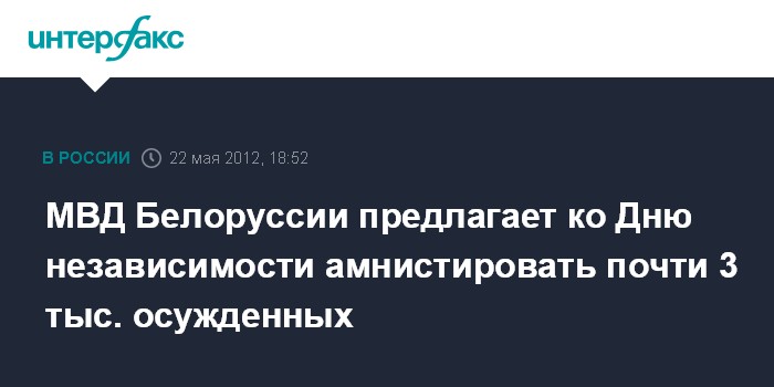 Минск. 22 мая. INTERFAX.RU - Министерство внутренних дел Белоруссии направило в правительство проект закона об амнистии, который предусматривает освобождение около 2,8 тыс. осужденных.