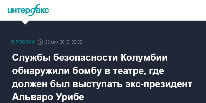 Богота. 22 мая. INTERFAX.RU - Сотрудники служб безопасности Колумбии обнаружили бомбу в здании театра, где должен был произнести речь бывший глава государства Альваро Урибе, сообщил во вторник в интервью агентству AFP источник в судебных органах страны.