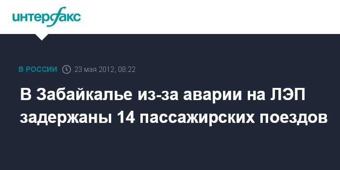 Чита. 23 мая. INTERFAX.RU - В Забайкальском крае во вторник из-за обрыва линии электропередач на участке Тарбагатай - Хилок было задержано 14 пассажирских поездов дальнего следования, сообщает в среду пресс-служба Забайкальской железной дороги.
