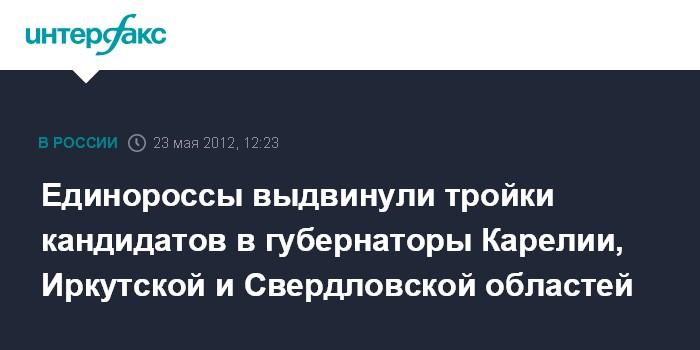 Москва. 23 мая. INTERFAX.RU - Руководство "Единой России" определило своих кандидатов на посты главы трех регионов - Карелии, Иркутской и Свердловской областей.