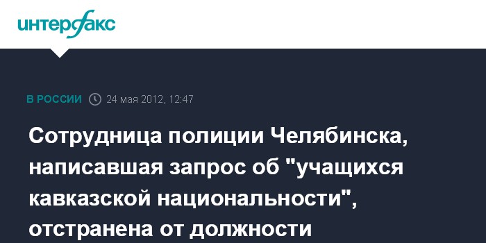 Челябинск. 24 мая. INTERFAX.RU - Начальник отдела по делам несовершеннолетних отдела полиции N5 Челябинска Юлия Пензина, разославшая в школы запрос о данных "учащихся кавказской национальности", отстранена от должности.